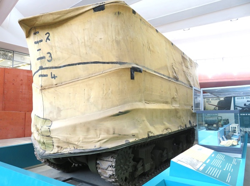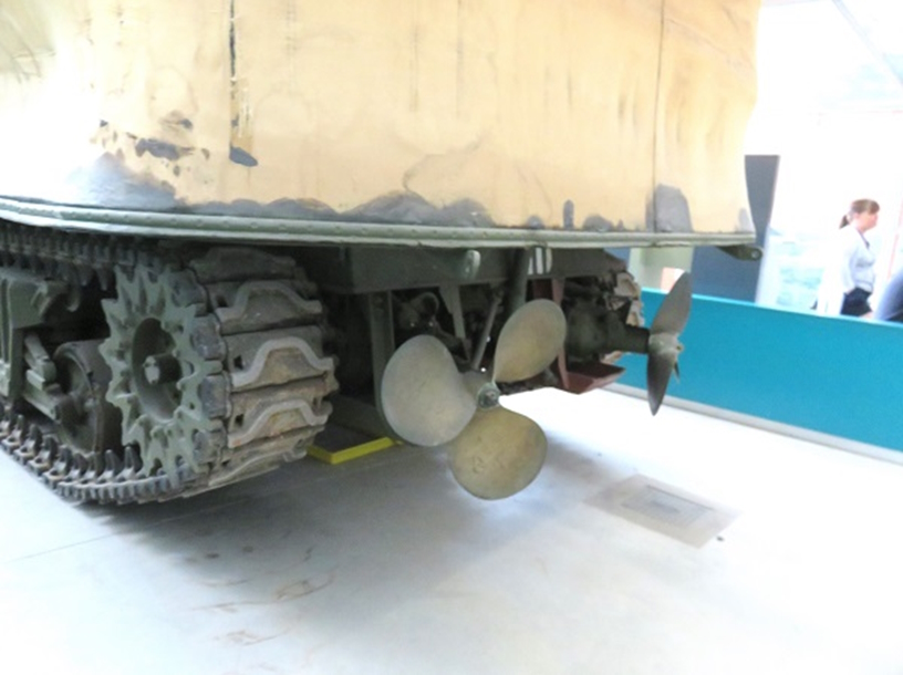 1944年6月6日、連合国軍はノルマンディ海岸に上陸作戦を敢行し、5カ所の上陸地点で、英軍の開発したシャーマンDD戦車がお披露目をしました。DDはDouble Drive(二重走行)の省略で、 シャーマンの車体体に、防水加工した折りたたみ式のキャンパス地のスクリーンとゴムのスカートを巻いて浮力を確保し、エンジンに駆動力抽出装置を取付けて2基のスクリューを回し、時速7kmで航海するという、アイデアに富む特殊戦闘車両でした。なおDDをDuplex Drive とする資料もあります。