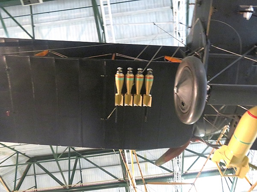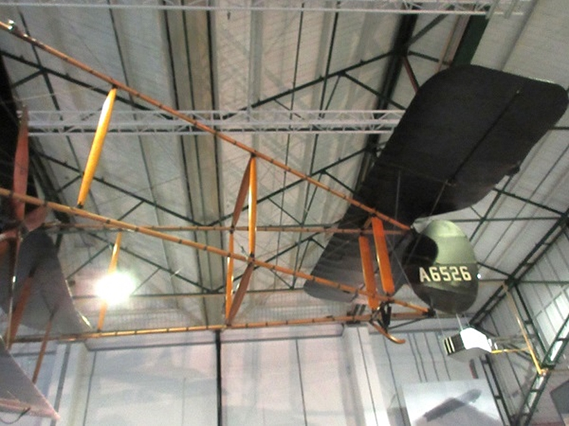 博物館の展示機は翼と尾部の支柱はレプリカですが、ナセルは1918年に製造された未使用の現物、ピアモドア・エンジンも現物です。F.EはFarman Experimental 2の略で、アンリ・ファルマン、モーリス・ファルマン兄弟設計の一群の複葉推進式機体を参考にして開発したことを示したのでしょうか。