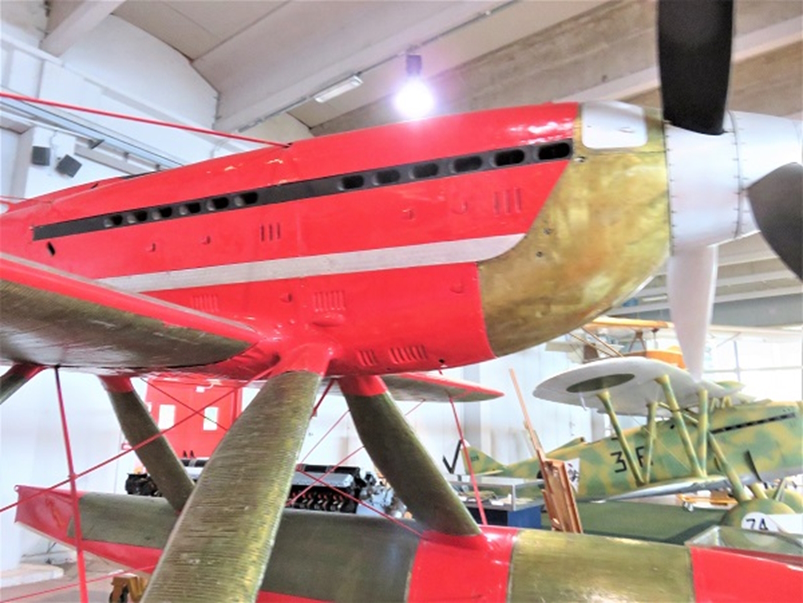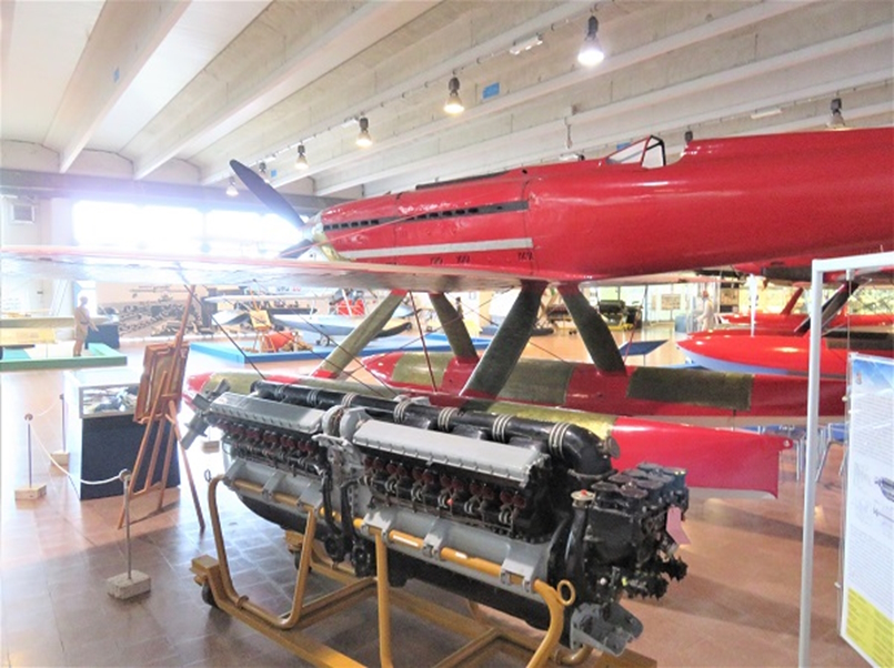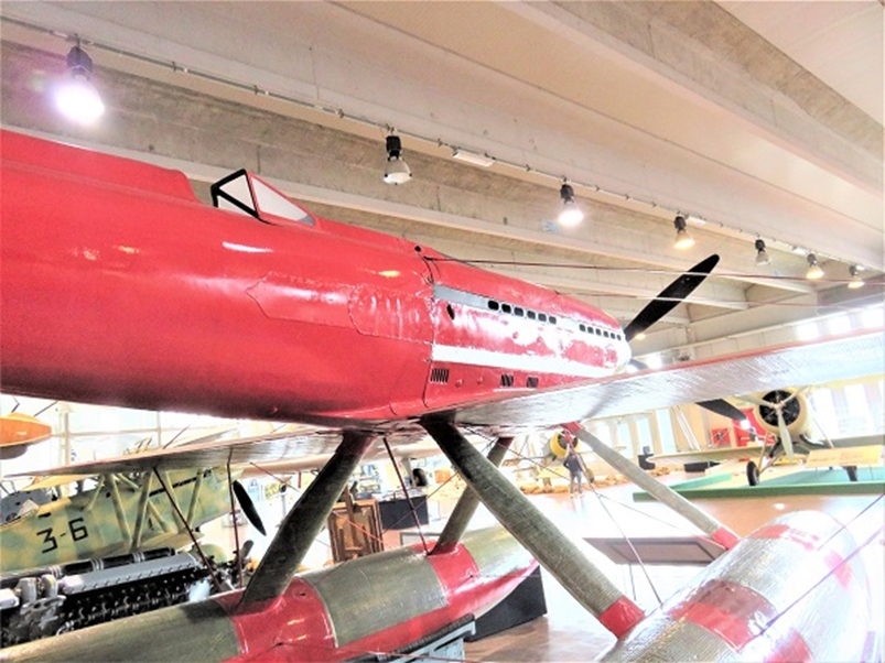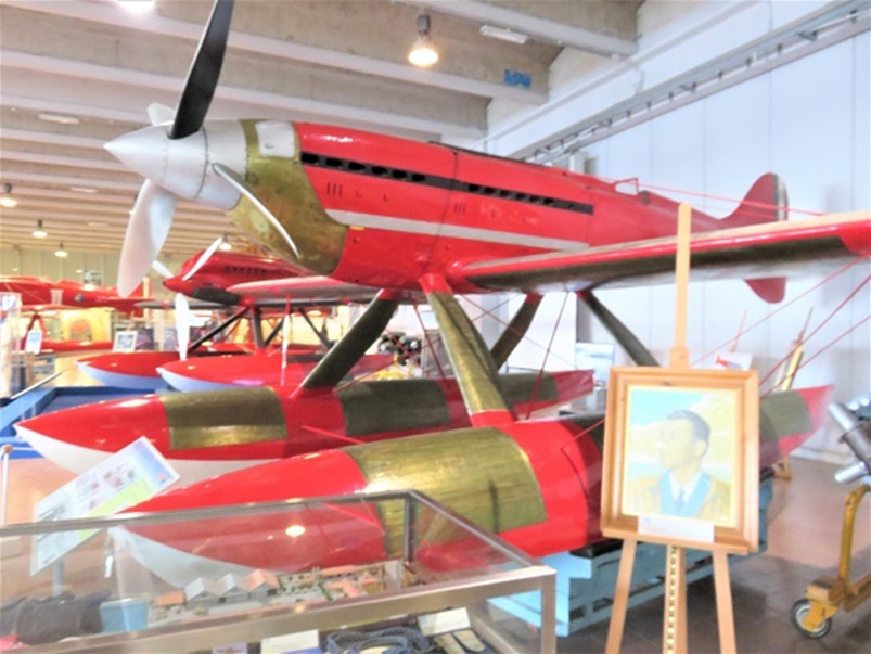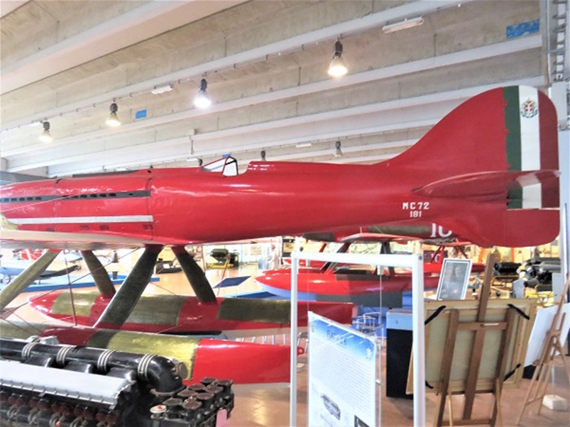 1934年10月23日、フランチェスコ・アジェロはマッキ M.C.72 水上機を操縦して、自身がM.C.72で前年に記録した水上機の世界速度記録682km/hを更新し、時速709.202km/hの不滅の記録を達成しました。(速度の小数点以下の数値を207や209とする資料があり ますが、本稿では博物館の標示に従いました)最後の飛行で世界記録を樹立したM.C.72は、故佐貫亦男教授の著作によると、記録を達成したガルダ湖南岸のディゼンツァノの町で保管されていましたが、その後トリノのイタリア空軍博物館に移り、次にミラノのレオナルド・ダ・ヴィンチ記念国立科学技術博物館で展示され、佐貫教授は1974年夏にミラノで見学されています。そして現在はヴィーニヤ・ディ・ヴァッレ(Vigna di Vally)空軍史博物館に翼を休めています。