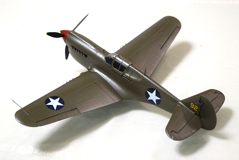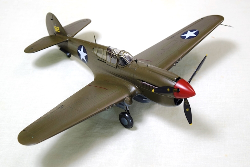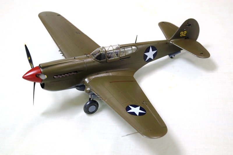完成。ちゃんとした形にするだけでも大変だった。これを可動でまとめた半世紀前のモデラーは凄い。キットとしての出来は、実機の1/32縮尺と考えず、レベルの1/32 P-40ウォーホークという1/1の立体造形物とみれば今でも最高水準の存在感だと思う。現代のキットとは、求めたモノが違うのだ。