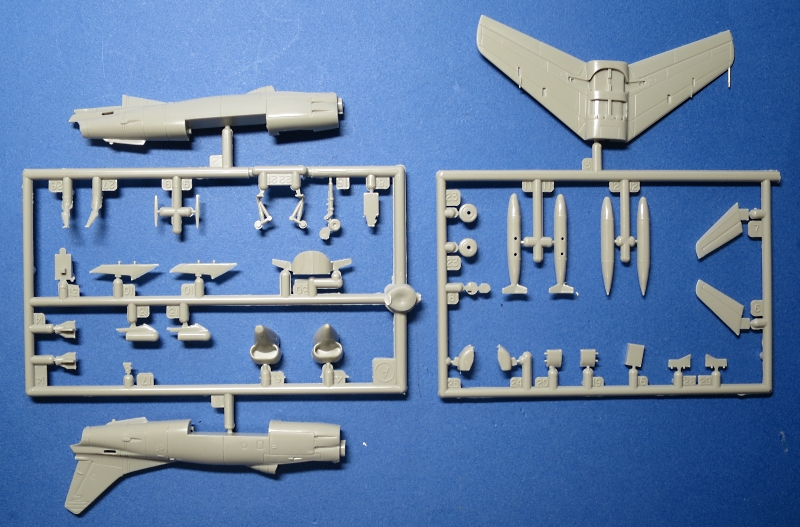 手持ち在庫は後年入手した再販版です。上は その箱絵、下はキット部品です。特徴としては全面スジボリ(現在の眼で見ると太目)、部品点数も少なく、組み立て簡単でしたが、各部の合わせは 1960年代設計金型のソレで、段違いなどが目立ちました。