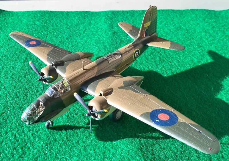 ここでやっと全体塗装に入ります。私はこのレベルのボックスアートが大のお気に入りでできるだけこの箱絵のように塗装したくてこのキット購入いたしました。したがって最初はイギリス空軍のボストンⅢの塗装を施します。上面ダークグリーン、ダークアースに下面スカイでMr.カラー特色セットを筆塗りいたしました。デカールはとても使用できそうもありませんし、不正確なので手持ちのストックからイギリスの国籍マークと三色旗をリクルート。シリアルナンバーだけはキットのデカールにフィルムリキッドを塗布してなんとか貼ることができました。
