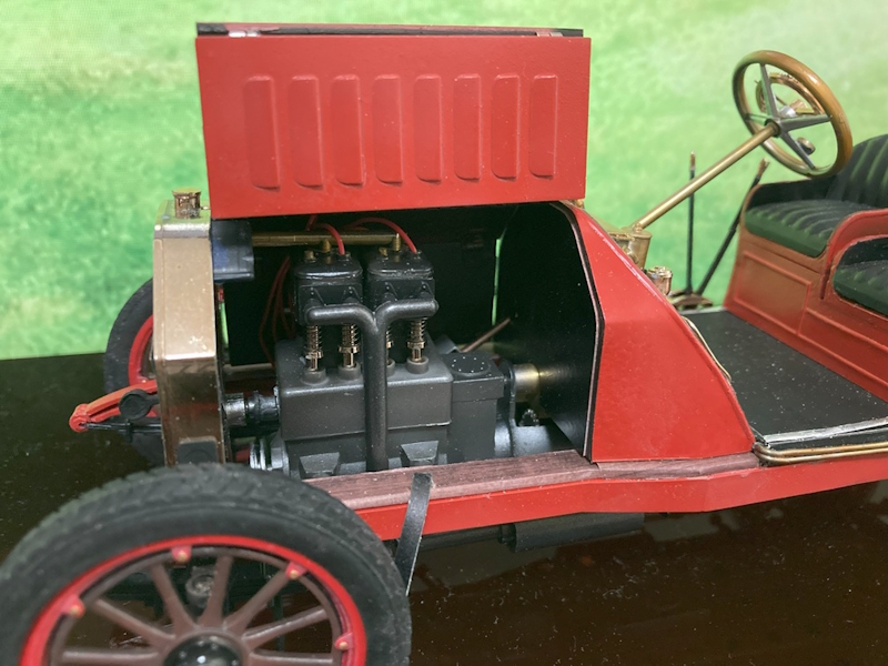 実車では14,500ccという途方もない排気量の巨大なエンジンがエンジンルームいっぱいに詰まっています。キットのエンジンはだいぶ小ぶりですが、電動ギミックを活かしたかったのであえてそのままで製作(実車でも排気量7,000ccのモデルではこんな感じのエンジンです)。エンジンフードは、実車同様中央にヒンジを設けてバタフライ式に左右に開くように改修しました。