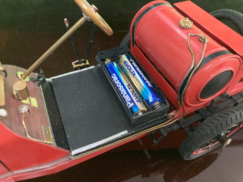 プロポーション改修により単2電池2本を内蔵するスペースはなくなってしまったので、単4電池2本をシート下に詰め込んであります(電源が小さくなってパワーが限られ、アイドリングはするけど自走はできず・・・)