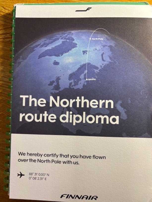 今回ヘルシンキまでは行きが日本航空、帰りがフィンネアーとなりました。以前はシベリア上空が開放されていたので、ヘルシンキは西欧で東京に一番近い都市でした。 現在JALのヘルシンキ航路は、北極に入ってカナダ沿岸を東行、グリーンランドを横断、ノルウェーからフィンランドへのコースで、かなり遠距離になっています。そのせいか2018年当時の機体はB787だったのに、B777になっていました。AYはAB350のままですが、私が初めてヘルシンキまで飛行した時と同じ北極点通過ルート。少し感激です。写真の北極点通過証明証も配布されました。