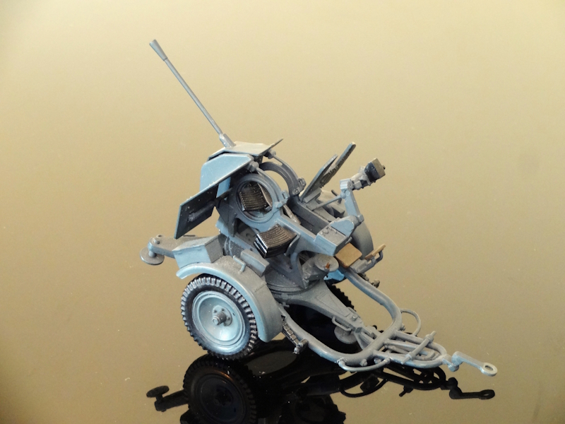 2cm Flak 38について小生は詳しくないので、ドイツ軍独特のリング式銃架、予備弾倉の保持方法、旋回/俯仰ハンドルの配置など フムフムとするだけです。ただ照準器は銃の俯仰に連動して動くはずですがキットではリンクは省略されています。またイタレリのキットには運搬台車が付いていて、取り外しできるのですが小生の場合は壊れそうなので外しません。