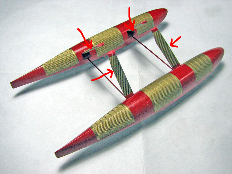 フロートの連結はエッチングパーツで行うようになっていますが、強度不足なので、真鍮パイプに置き換えました。