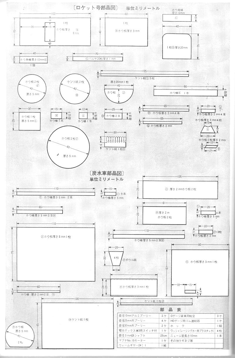 その中に ロケット号を作ろうというコイヌマケイイチ氏による工作記事が掲載されており、掲載部品図を基に ホオ板、バルサ板、ケント紙、モーターなどで動く模型を製作しようという内容です。著作権調査のため 国会図書館で調べたところコイヌマケイイチ氏は1940年生まれで この記事を書かれた時は28歳。残念ながら連絡はとれませんでしたが、ご存命ならば今年85歳になられているはずです。