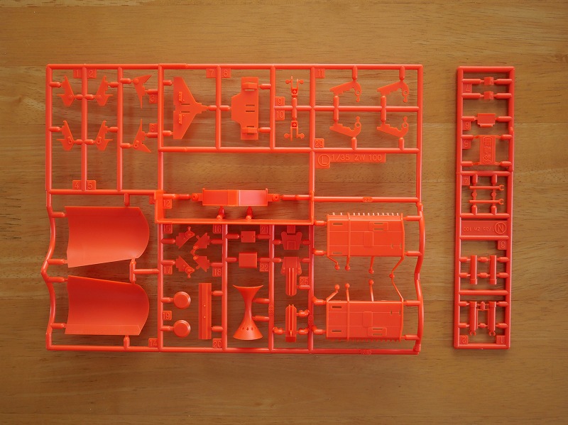 除雪仕様機のパーツを、ホイールローダ ZW100-6のキットと比較すると、ショベル関係のランナーKがなくなり、そのかわりに、L、N、Qの3種のランナーが加わっています。除雪仕様機の方が、パーツ数が多くなっていて、価格も上昇しています。