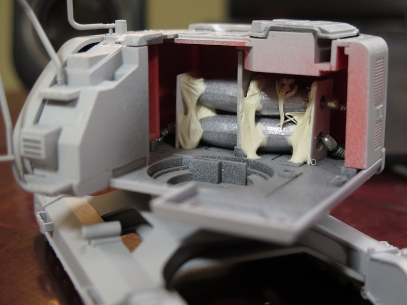 長い腕とバランスをとるため、エンジンルーム内にオモリを入れるよう指定がありますので、百円ショップで釣り用のオモリを買って自作のプラ板とパテで固定しました。