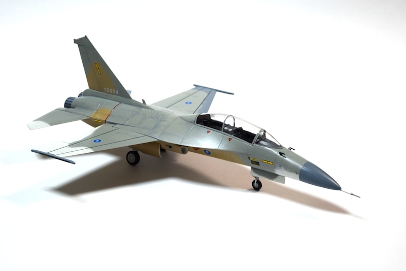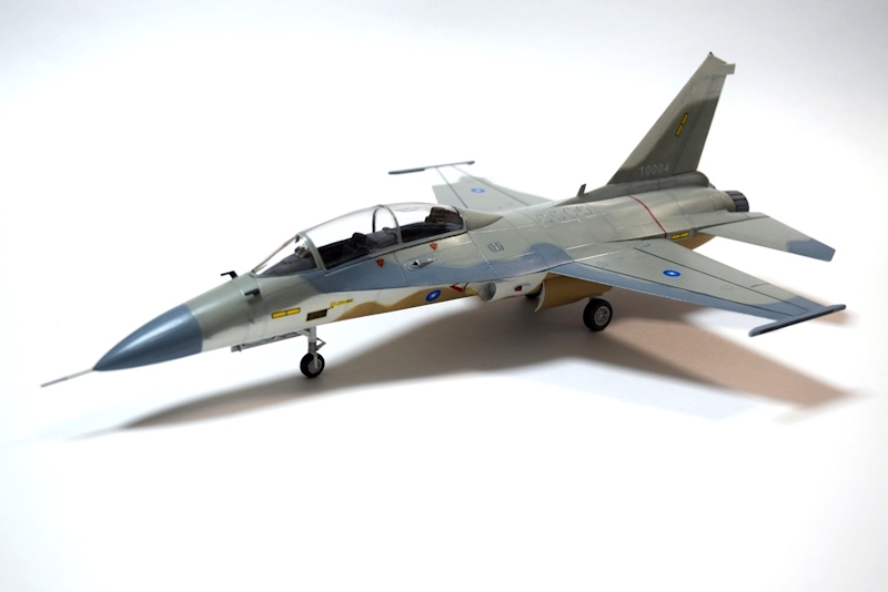 垂直尾翼は補助板が邪魔で隙間が生じるので切り落とし、イモ付けにする。主翼も同じ理由でイモ付けにする。「あれ?」とここでやっと気付く。主翼平面形が違うぞ。経国はF-2みたいに後縁に前進角があるはずだが、キットはF-16みたいに真っ直ぐなのだ。胴体の背中の感じも違う…。ウ~~ん、どうやらF-16の胴体を新造して経国っぽくした製品だと判断した。側面の形の違いはプラモデルで気付きにくいとしても、主翼平面形はちょっとなァ。