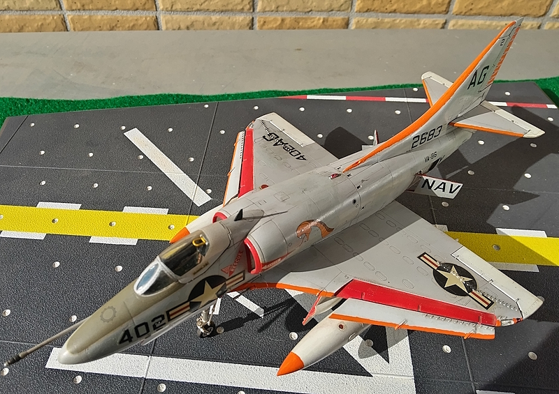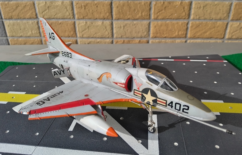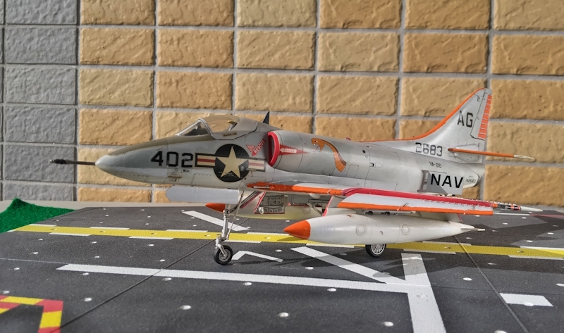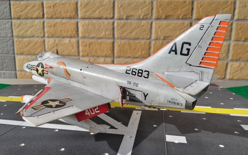 まずはコクピットから製作していきますがヱスキャパックのシートを組み立てて前脚庫と一体になった床部分にバルクヘッドや計器盤、コントロールスティック、フットペダルとともに接着すれば完成です。このスケールではこれで十分だと思われますのでそれぞれ丁寧に塗り分けておきます。ダクト部分を白と銀で塗り分け、後部排気口とコクピットを胴体右側に接着したら、機首前部に錘を入れておきます。かなりテイルヘビーですので少し多めに入れておきました。これで左右の胴体を接着します。嵌め合わせは問題ありませんでした。インティーク部分は段差や隙間ができやすいところですので十分に仮組を行い、できるだけきれいに接合できるように調整しておきます。様々な型式に対応するためパーツ分割が複雑になっていますが説明書通りに組み立てていけば問題ありませんでした。主翼は一体型式の下翼と左右の上翼で構成されており、前縁のスラットと後縁のフラップはダウン状態にもできるようになっております。基本静止時には両方ともダウン状態が正常なので全体塗装終了時に取り付けることとします。パイロン取り付け用の穴は指定通り中央と内側の部分をピンバイスであけておきます。外側のパイロンはE型以降で装備されたものですからあけないこと。主翼の組立が終了したら胴体に接合します。ここの嵌合も問題はありませんでした。水平尾翼は左右できっちりと嵌め合わせができるようになっていますので塗装終了後に取り付けることにしました。