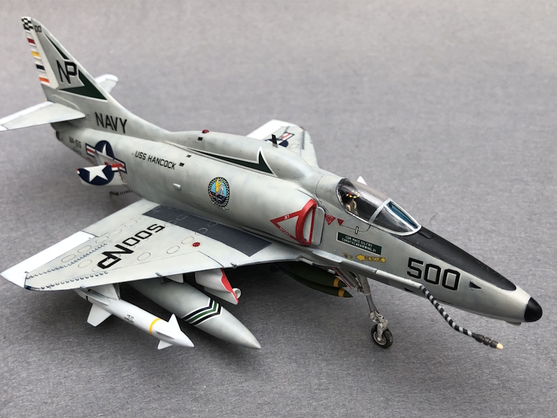デカールが新しくなって再販されたものです。M型と比べるとキャノピーがかなり小型ですね。金型が古いので細かなパーツのバリは否めませんが完成してしまえばブサかわいいスカイホークが出来上がります。主翼上面の楕円形のハッチを描くのに苦労しました。