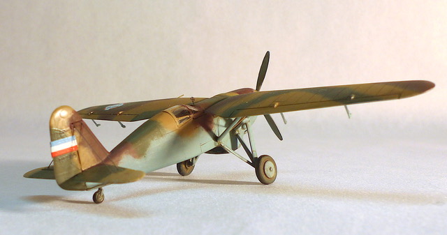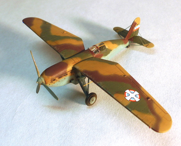 キットはアズールスタンダードな簡易インジェクションです。事前に擦り合わせをすれば難しいものではありません。塗装はパターンごとに型紙を貼って吹いてから主翼上面にはC310ブラウンを細吹きで境目をぼかしてます。胴体は筆でドライブラシの要領で境目をぼかしてあります。