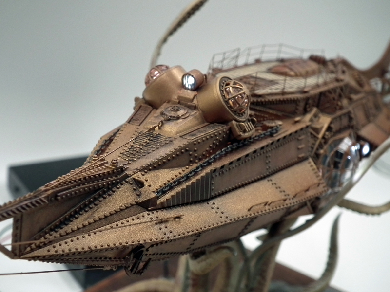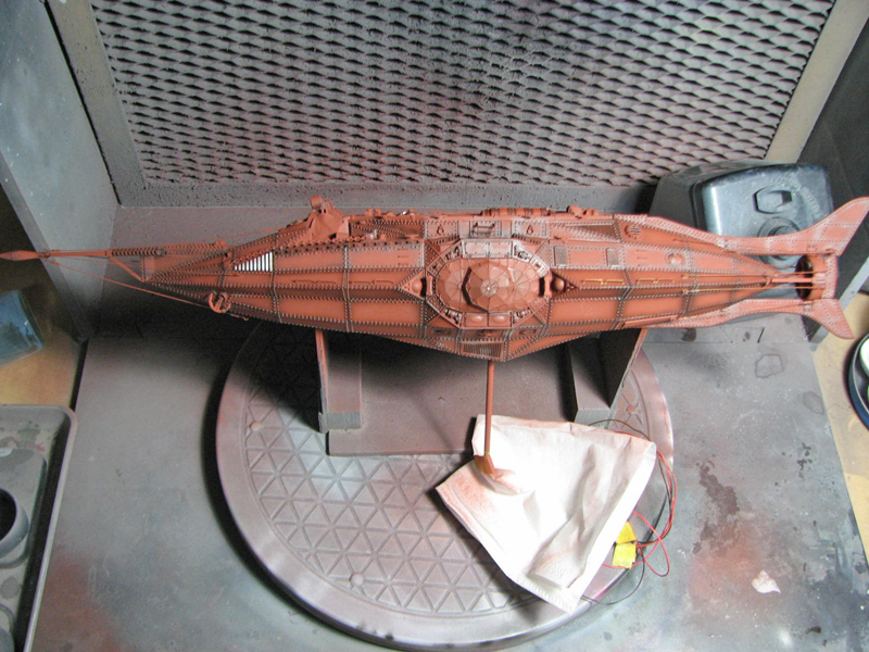 ノーチラス号本体はオキサイドレッドサフを下塗りした後、クレオスのカッパー6、ゴールド3くらいの割合で混ぜた物に銀と白を少々加えた色を、下地を薄っすらと残すくらいに吹きました。