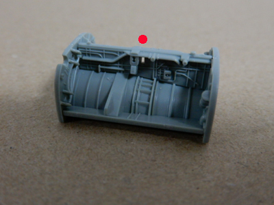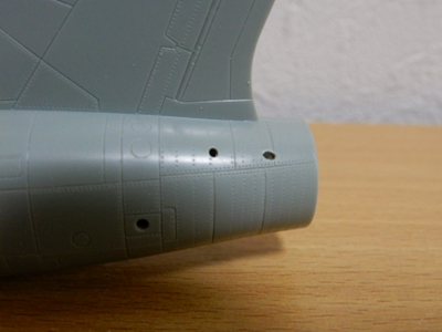 胴体後端のサブエアインテークの取り付けのための穴は,胴体部品の裏側のガイドに従って小径ドリルを使って開口するようになっています。