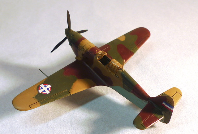 12月号に投稿したものは酷い出来だったので作り直しです。某中古屋で手に入れました。古い簡易インジェクションで主翼の取り付けにはフェアリングの段差の処理等大変でした。このキットはi f(イフ)のついたパケージで、IK-3を使わなかった各国の国章が入っている架空の機体でした。肝心のユーゴスラヴィアの国章は入ってません。そのため主翼上面の国章はほかからの流用で下面は筆書きです。