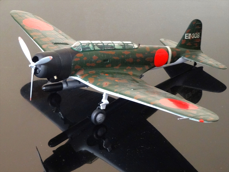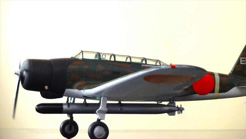 塗装は真珠湾作戦時の空母瑞鶴所属機のつもりです。当時、瑞鶴の所属機は雷撃隊に配置されなかったらしいのですが、考証は置いといて、九七式艦攻にはやはり魚雷を抱かせて完成としました。同作戦では無線封止に対応してリーダー機以外はアンテナ柱まで外した機体が多かったとの事でそれに倣いました。