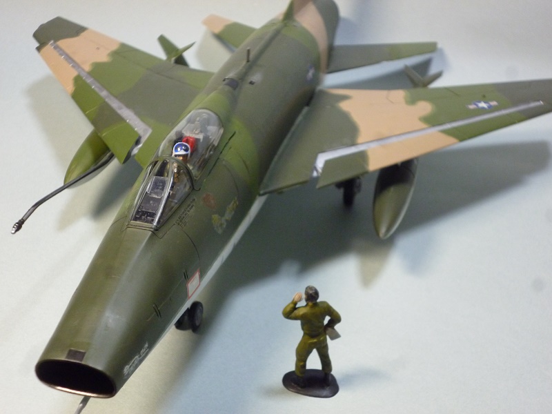 ガン・ベイ左右の扉がはめ込みで、ここを外すと機関砲と給弾システムがみえるパーツ割になっている。モノグラムのセンチュリー・シリーズのお約束だが、ともに閉じて作ることにする。ここで工作の時短をはかったつもりであったが、胴体の合わせでつまづき、この修正に大分時間をとられてしまった。上下分割の胴体が合わないのだ。何度も仮合わせをしてみて、胴体上部のパーツの幅がせまいことがわかった。金型ではぴたりと合う設計であったろうが、型抜き後の胴体上部パーツが内側に収縮、幅が狭くなったのだ。あれこれ考え、やむを得ぬ修正工作をする。上下の食いちがいをなるべく小さくして接着し、主翼を取り付けたのち、継ぎ目と隙間をパテ埋めし、ペーパーでならした。主翼と胴体の間にも隙間が出来ここも同様の工作をする。修復箇所が多くなったことで、表面仕上げが目立つ銀塗装をあきらめ、地味なベトナム迷彩とする。