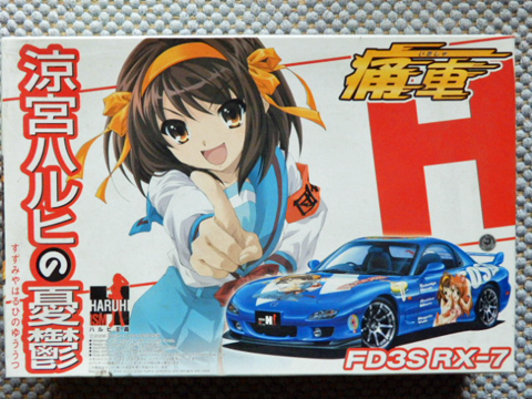 アオシマの痛車キット第1号です。アオシマのカーモデルが,これ以降,飛躍的に進歩したと言われている名作キットに,人気が高かった”ハルヒ”のデカールを組み合わせたという夢のような製品です。初版は,「デカールが透けて白い部分が青っぽくなる」と某ホビー誌で指摘されていましたが,その後の再版でこの問題は解決したと聞きました。それではと,購入したのですが・・・,デカールが無い!どこにしまい込んだのか?