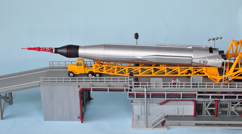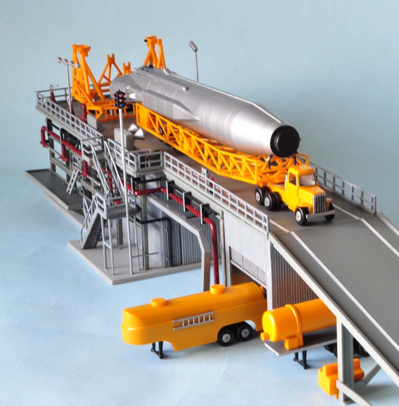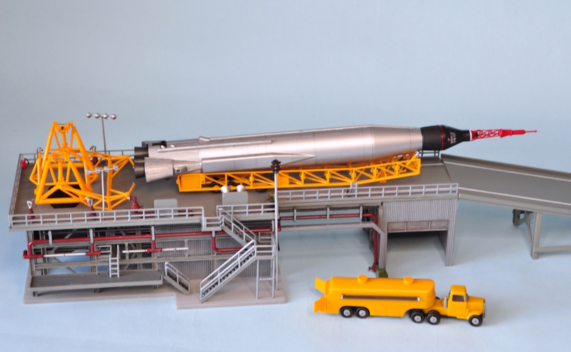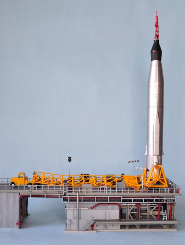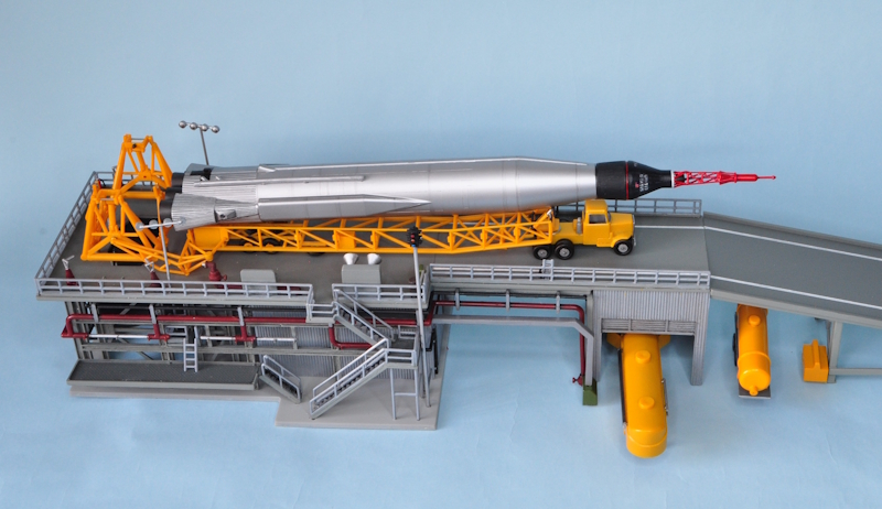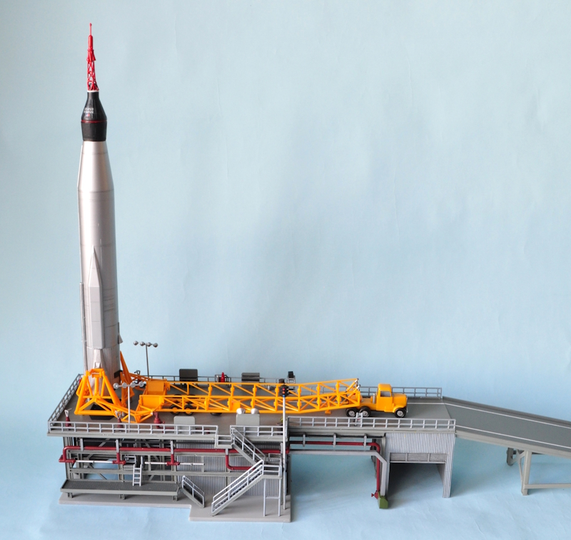題名のアトラスロケットとマーキュリー宇宙船は17点の部品で出来ていますが総部品点数200個のキットのほとんどは周辺機材と発射台構造物で構成されています。