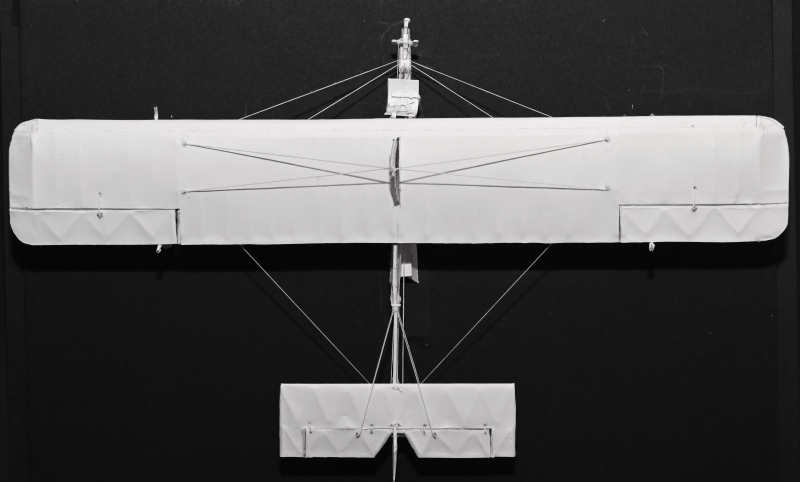 実機の主翼と胴体間には支柱は無く張線によって形が保たれますが、模型でも糸を張ると頑丈になります。