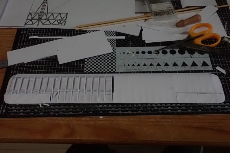 ステンレス針金を仕込んだ2本の主桁に小骨を付けて主翼を作りました。