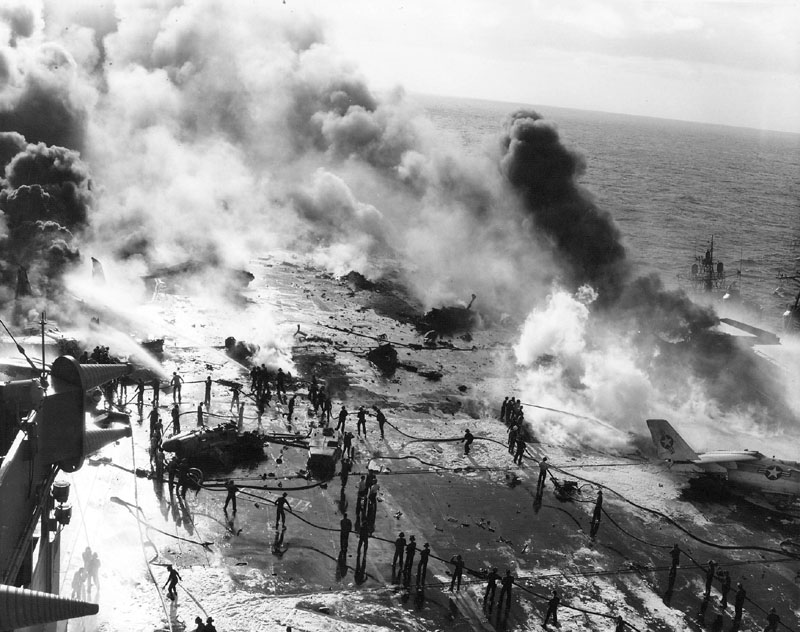 出火後、消火活動に追われる空母エンタープライズの後部飛行甲板。A-7の残骸が見える。