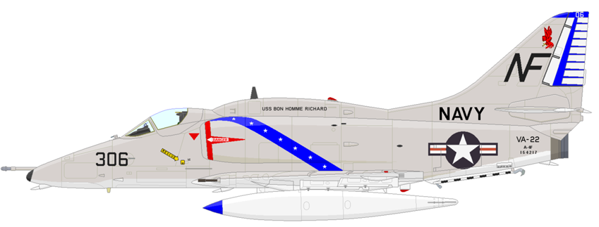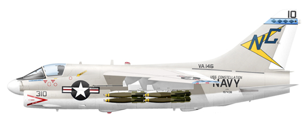 | CVW-5の攻撃飛行隊は依然A-4Fを使用していたが、ほぼ同時にヴェトナム沖に展開した空母CVA-66 “USS America”に搭載されていたCVW-9には、新鋭のA-7Eを装備するVA-146とVA-147が配備されていた。A-7