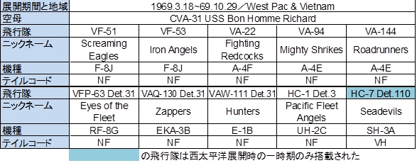 表11-1 1969年3月18日~1969年10月29日の西太平洋/ヴェトナム展開時のCVW-5の編成