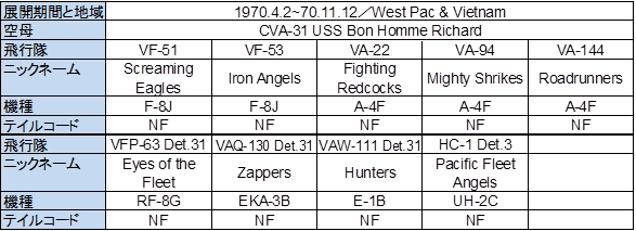 表11-2 1970年4月2日~1970年11月12日の西太平洋/ヴェトナム展開時のCVW-5の編成
