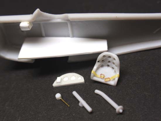 コクピットからの製作です。床板を接着して計器版等は自作、シートはキットのパーツを利用。シートベルトはマスキングテープの細切りに銅線で作った金具を装着しました。