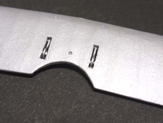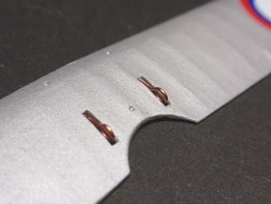 上翼の中央には2つのヒートン状の金具がついていて、これをエルロンコントロールホーンと言い、操縦桿と連動して翼の中のロッドを動かしてエルロンを可動させます。