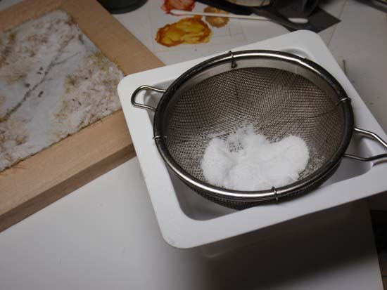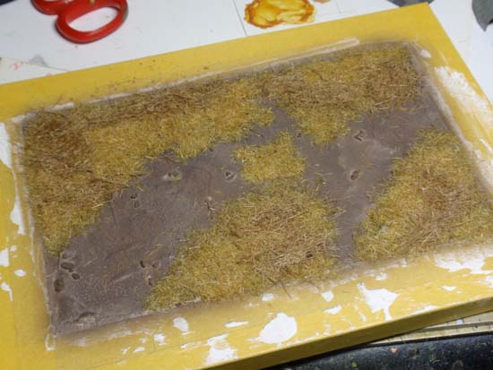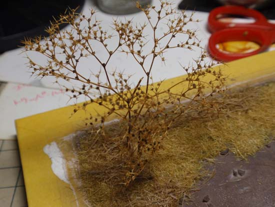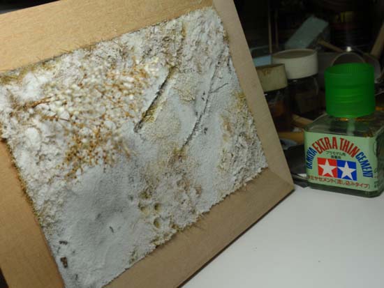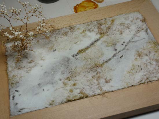 ベースもいつものようにダイソーのフォトフレーム。タイルの目地材を流し込み塗装します。鉄道模型用のシーナリーグラスを適当にばら撒いて水生ボンドで接着。ポイントでドライフラワーの細い枝を植えました。今回はロシア=寒い=雪ということで雪景色にしてみました。雪の表現は重曹です。シャビシャビにした水性ボンドをベースに置く感じで塗り、重曹を茶漉しでランダムに撒いていきます。時間が経つとちゃんと定着してくれます。