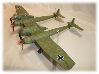 この機体を只捨て去るのではなく、より発展させた物がこのZ案でした。この機体を使い大航続力の高性能偵察機が、計画されました。ペーパー機案なので、実機は有りませんが、ここが模型のいいところです、出来上がると、翼幅40cmを超える大迫力の機体を、手にする事が出来ます。仕様は中央部キャビンは偵察員と偵察用カメラ2基、後方防御用自動追尾機関砲2基装備で、右キャビンはBタイプと同じ装備としています。また、尾部支柱にも、ハーケンクロイツ旗をお洒落に装備。と言う仕様で作ります。 |