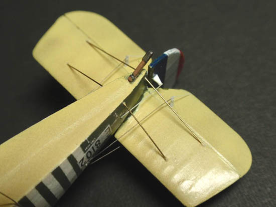 尾翼周りのリギングは0.2の真鍮線、テグス、伸ばしランナーなど、いろいろと取り混ぜての工作です。翼間の糸張りはいつものように鮎釣り用のテグス。