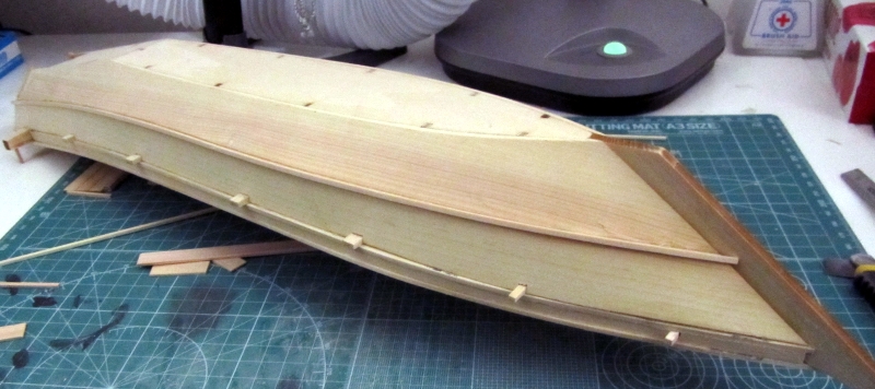 次に外板張りです。ここが組み立ての最初の難関ですね。外板をフレームに沿って曲げて船体の曲がりに合わせるわけです。説明書には 水もしくは湯で表面側を湿らし軟らかくして曲げグセをつける方法が説明されています。しかし外板中央はその方法で曲がっても、外板が幅広いため、外板の前後部両端はなかなか三次元に上手く曲がらず、結局後にやかんで湯を沸かしその蒸気で曲げ直しました。 ただし、ヤケドしないよう充分に注意します。