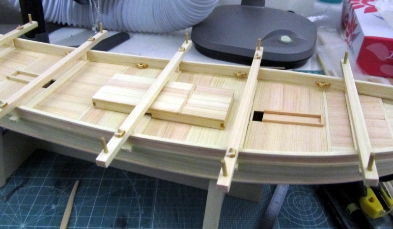 甲板の組み立てでは、原寸図を参考にしながら採寸し組み立てていきますので、忍耐力の要るところですね。