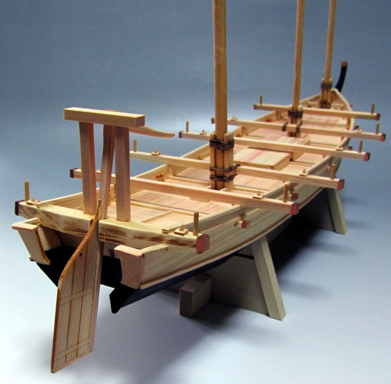 帆柱を立て、帆を取り付け、ロープを取り付けます。説明書をよく見て行えば出来ますが、弛まないように上手く張るには結び目を瞬間接着剤で固着しながら行うとよいようです。のぼり旗と櫓を取り付ければ完成です。