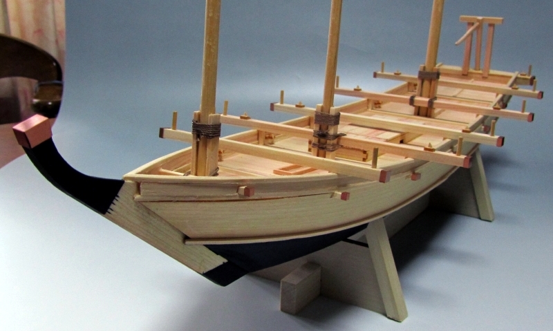 この後、蛇の加工や帆柱、帆桁の加工になります。丸棒をテーパーに削るのは大変根気のいる作業ですので地道な工作が要求されます。出来ればここだけでも加工されていると良かったと思います。 船梁と櫓床の端面にエッチング板を曲げ、取り付けます。単純な箱組みなので問題ないと思います。