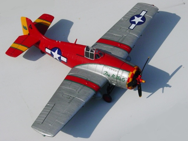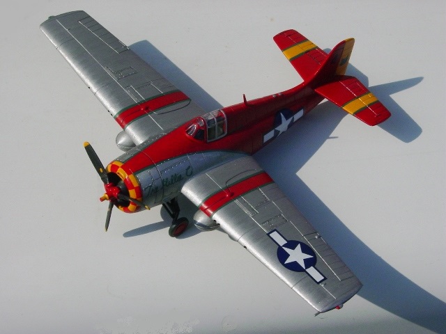 | ギラー少佐が海軍に籍を置いていたとされるときの乗機、“ザ・ミリー・C”である。「Fake Aviation」誌1962年4月1日号に紹介されているという(作者未見・当然である)。似た塗装の機体はムスタングにもあるようで、『航空情報』1962年6月号の原色図に、それがある。真っ赤なムスタングで、“ザ・ミリー・P”号だそうだ。真っ赤なムスタングは以前、レベル社のファイター・シリーズで採用されていた。 |