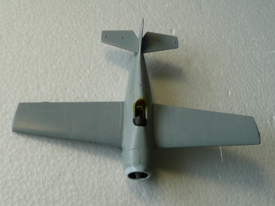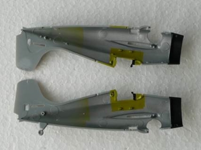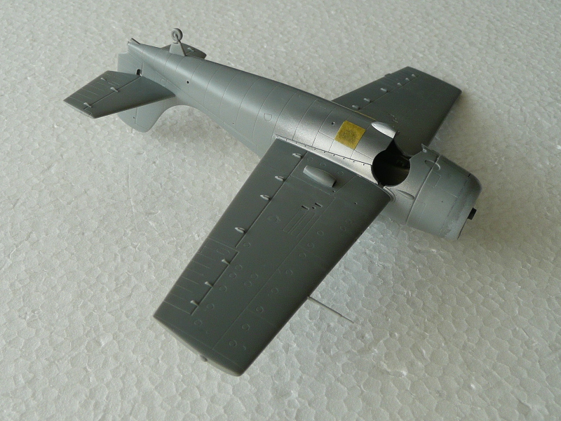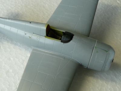 F4F-3はF4F-4と外観的にはほとんど同じため、箱の中にはF4F-4のキットが入っていました。実機ではF4F-3の主翼には折りたたみ機構がなく、また12.7mmの機銃も4門でしかも内側の2門は少し銃身が翼前方に突出しています。そのためこのキットでは、F4F-3への修正指示がインストに記載されていました。その点は抜かりないハセガワさんですが、モデラー側から言わせていただくと、主翼ぐらいは修正して欲しかったと思いました。ただデカールに、Aero Master製のものが入っていたので、その不満も帳消しとなりました。デカールには空母レンジャー搭載のグリーン・テイルのVF-41所属機と、空母ワスプ搭載のブラック・テイルのVF-72所属機の2種類が入っていましたが、本作例では前者の塗装に仕上げています。 |