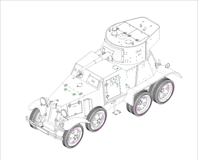 ④ ソビエトの装甲車で、レニングラードにあるイジョルスキー製作所にて前作BA-3を改良するかたちで開発されました。45㎜戦車砲と7.62㎜DT機銃を装備し、1930年代当時としては最強の戦闘力を持った装甲車でした。全長14.1㎝、全幅6㎝、砲塔および車体はスライド金型により再現、精密なパターンが入った合成ゴム製タイヤ付き、パーツ数250以上、エッチングパーツ付き。