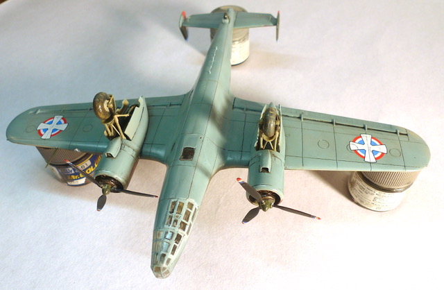 三色迷彩はパターンを切り抜き吹きました。前方機銃を入れるため窓に穴を開け飛び出した分は完成後に接着。それにしてもイスパノ20ミリ機関砲はデカくてコックピット目一杯です。