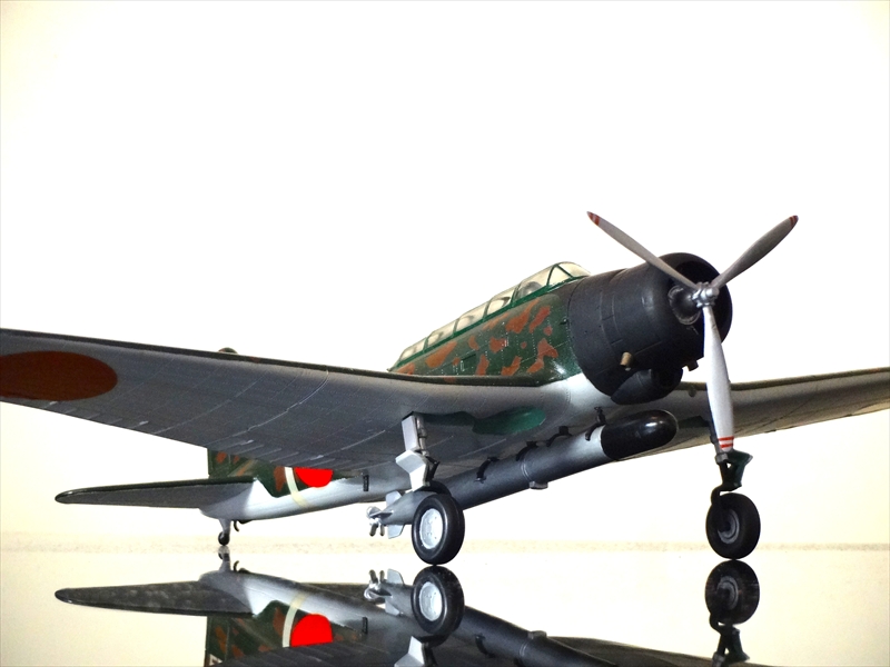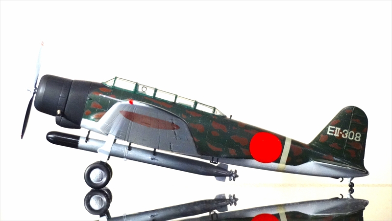 塗装は真珠湾作戦時の空母瑞鶴所属機のつもりです。当時、瑞鶴の所属機は雷撃隊に配置されなかったらしいのですが、考証は置いといて、九七式艦攻にはやはり魚雷を抱かせて完成としました。同作戦では無線封止に対応してリーダー機以外はアンテナ柱まで外した機体が多かったとの事でそれに倣いました。