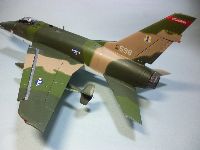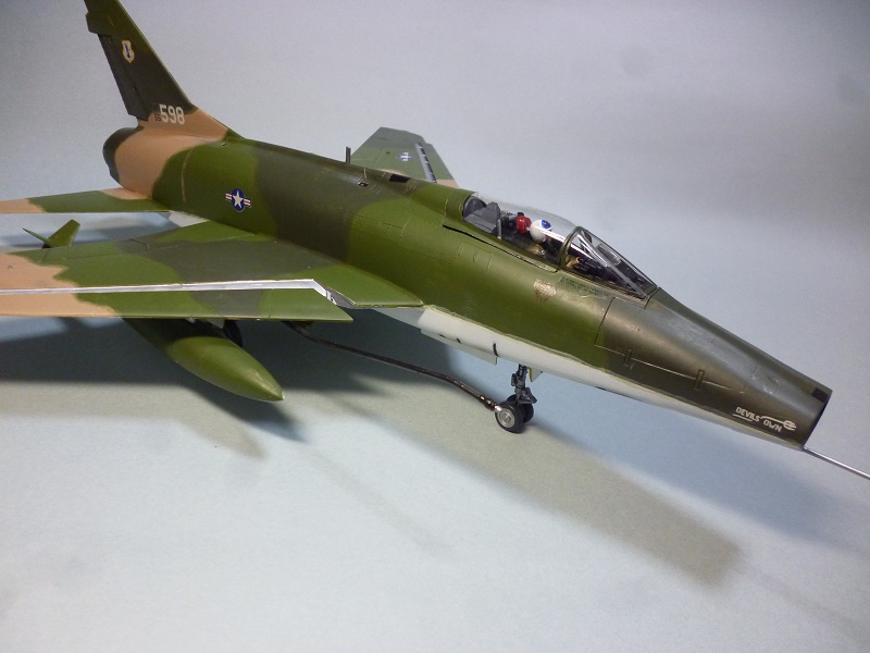ガン・ベイ左右の扉がはめ込みで、ここを外すと機関砲と給弾システムがみえるパーツ割になっている。モノグラムのセンチュリー・シリーズのお約束だが、ともに閉じて作ることにする。ここで工作の時短をはかったつもりであったが、胴体の合わせでつまづき、この修正に大分時間をとられてしまった。上下分割の胴体が合わないのだ。何度も仮合わせをしてみて、胴体上部のパーツの幅がせまいことがわかった。金型ではぴたりと合う設計であったろうが、型抜き後の胴体上部パーツが内側に収縮、幅が狭くなったのだ。あれこれ考え、やむを得ぬ修正工作をする。上下の食いちがいをなるべく小さくして接着し、主翼を取り付けたのち、継ぎ目と隙間をパテ埋めし、ペーパーでならした。主翼と胴体の間にも隙間が出来ここも同様の工作をする。修復箇所が多くなったことで、表面仕上げが目立つ銀塗装をあきらめ、地味なベトナム迷彩とする。
