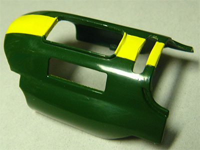 リアカウルも同様にマスキングして、イエローストライプ塗装を行います。(写真12,13,14,15) |