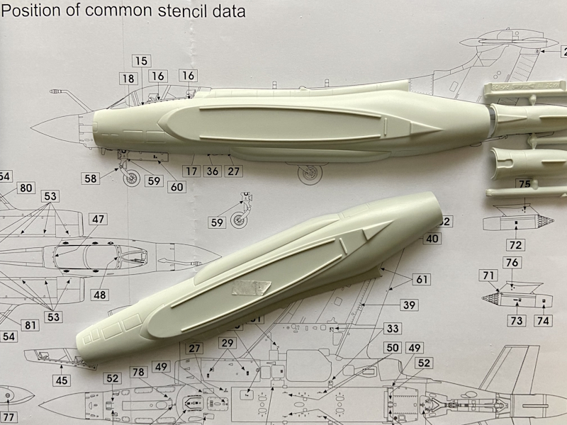 ボディはパネルラインを一旦埋めて改めて彫り直し ついでにエアブレーキを自作しています。下面後端部のチャフディスペンサーやスキッドなども自作して取り付け 主翼の増槽は1/48F4Uコルセアのそれを改造して取り付け そのほかのパイロンはプラ板から削り出し、ぶら下げものはハセガワのウエポンセットを使いました(ペイブ・スパイクやサイドワインダー等)。