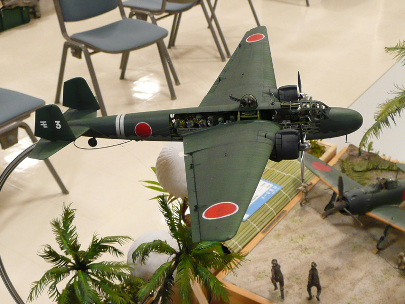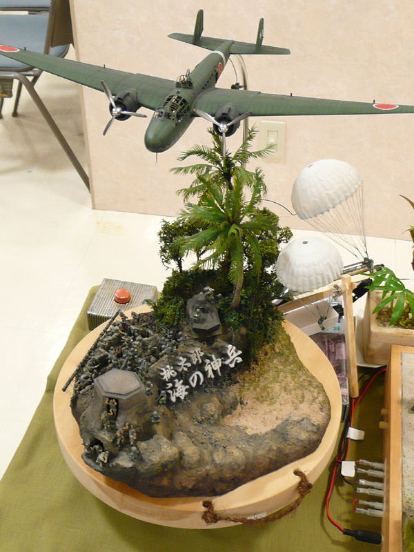 桃太郎“海の神兵”と名付けられたジオラマです。ハセガワの96陸攻からの改造かと思われますが、機体だけでなく搭乗する兵士のフィギュアや落下傘兵など、精密に工作された、見事な作品でした。