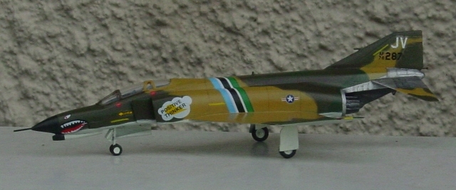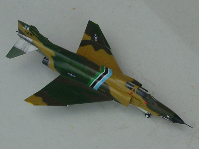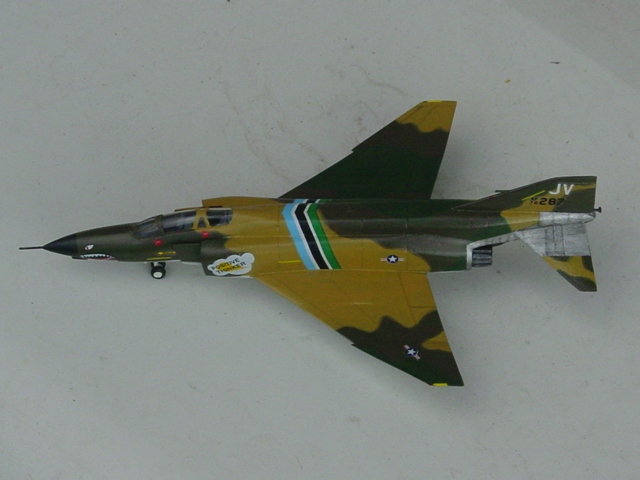 “下面の合わせはイカンなぁ”とかは、見なかったので分からない。キャノピーを載せてみる。“後部に隙間があるな”と思うよりも先にプラバンで埋めておけば全然気にならない。アクセサリーでミサイルと燃料タンクがある。やや大きすぎる感じだが使わなければ関係ない。主脚カバーは切断して使うが、これはキット指定の方式。下面にある凹みと脚カバーが全然違う形だなんてことは、気付かなかった。 |